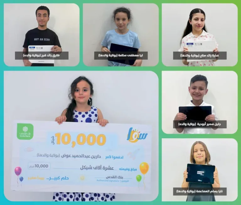 لأن الاستثمار في الأطفال هو استثمار في الغد، ولأن الحلم يستحق أن يُغذّى من أول خطوة، واصل بنك القدس ترسيخ ثقافة التوفير بين الأسر الفلسطينية عبر برنامج حساب التوفير “سوا”، البرنامج المصمم خصيصًا لأحلام الصغار وطموحاتهم، والذي يحمل شعار: “وفّر لمستقبلهم، وفّر لنجاحهم، وحقّق حلمهم” ويوفر البرنامج جوائز سخية تصل إلى 40,000 شيكل موزعة على أربعة فائزين، إلى جانب 20 جهاز تابلت لأطفال موزعة على عشرين فائزاً.