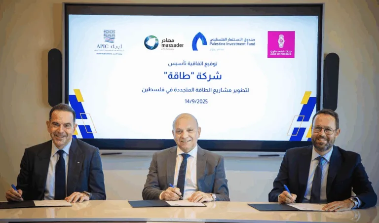 15/9/2025- رام الله- وقّعت كل من شركة مصادر، الذراع الاستثمارية لصندوق الاستثمار الفلسطيني في قطاع الطاقة، والشركة العربية الفلسطينية للاستثمار (أيبك)، ومجموعة بنك فلسطين، اتفاقية شراكة استراتيجية لتأسيس شركة “طاقة”، التي ستُشكّل كياناً اقتصادياً واستثمارياً وتطويرياً رائداً لتعزيز قطاع الطاقة المتجددة في فلسطين.
