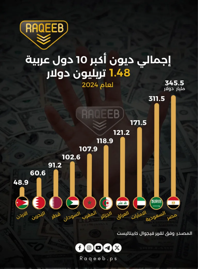 اجمالي ديون اكبر 10 دول عربية 1.48 ترليون دولار لعام 2024