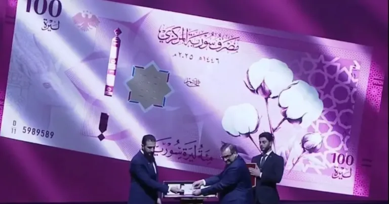 وخلال حفل ضخم في قصر المؤتمرات كشف الرئيس أحمد الشرع وحاكم مصرف سوريا المركزي عبد القادر الحصرية عن العملة السورية الجديدة، وفق وكالة الأنباء السورية “سانا”.