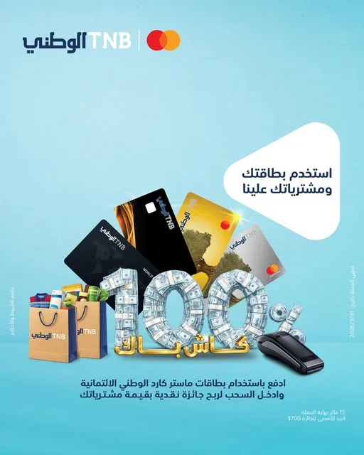 رام الله – 15/2/2026: أطلق البنك الوطني اليوم حملة استرداد نقدي لمستخدمي بطاقاته الائتمانية من ماستركارد باختلاف أنواعها، تكافئ المستخدمين بفرصة الفوز بإجمالي المبلغ الذي تم انفاقه بواسطة البطاقة الائتمانية خلال فترة الحملة، التي تنتهي بتاريخ 31/3/2026. يقدم البنك 15 جائزة نقدية بقيمة الانفاق، حيث يحصل الفائزون على استرداد نقدي بقيمة اجمالي الاستخدام الذي تم خلال فترة الحملة، وبسقف 700 دولار للفائز الواحد.