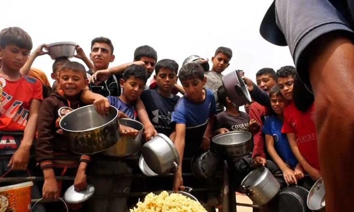 لا يحمل الرجل في يده إناء كبيرا، بل وعاء صغيرا يكفي بالكاد لإطعام أطفاله الثلاثة. يراقب البخار المتصاعد من القدر كما لو كان يراقب فرصة النجاة الوحيدة لعائلته في هذا المساء.