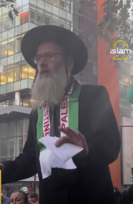 Rabbi Dovid Feldman, spokesperson for Neturei Karta, an international Orthodox Jewish anti-Zionist group addresses a crowd in downtown Montreal in reaction to the Israeli government turning off Gaza’s electricity and water.
