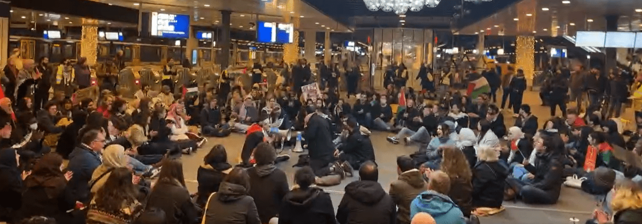 Home»International Solidarity»A protest stand inside the main train station in the Dutch city of The Hague in support of Palestine
